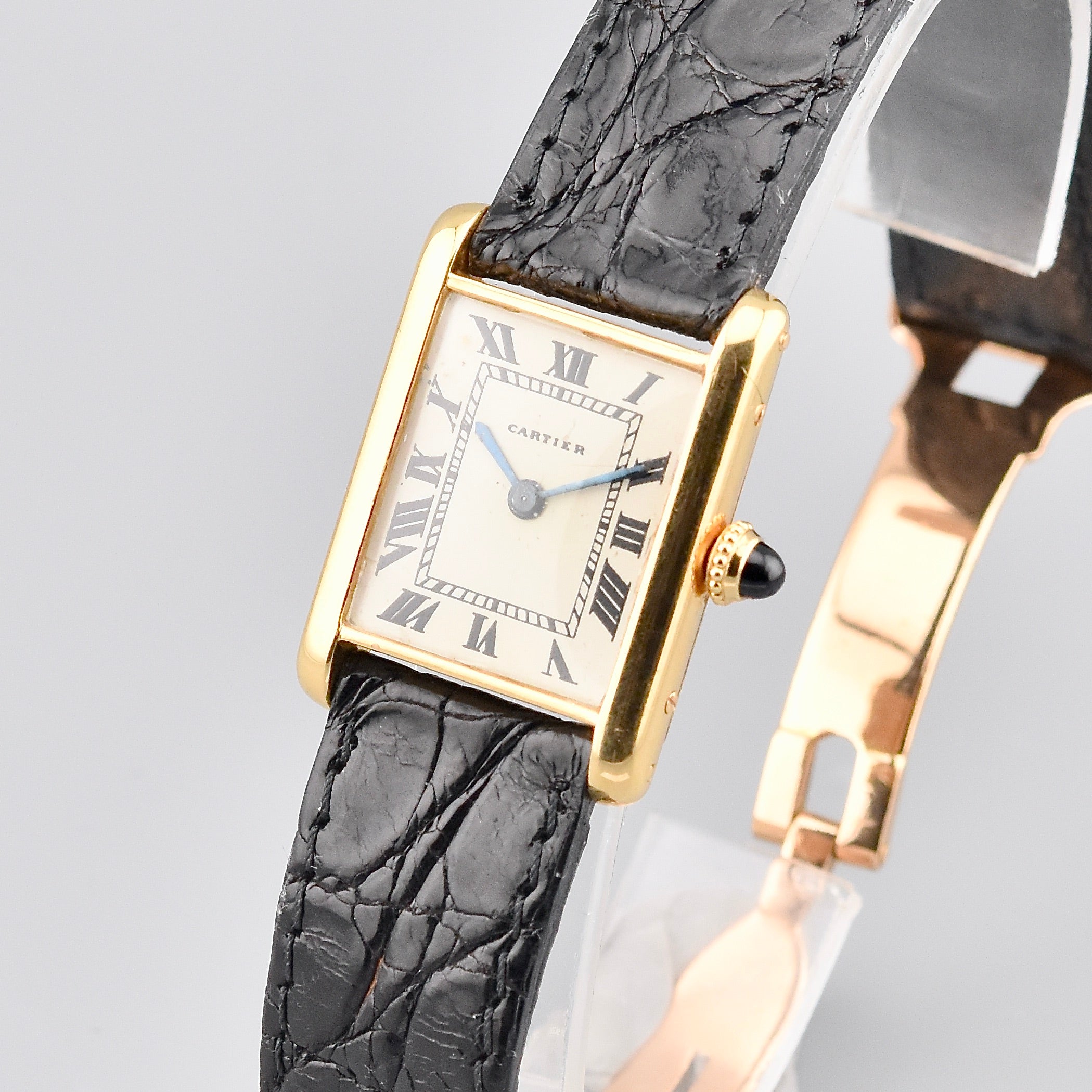 Très jolie montre bracelet de dame Cartier Tank en or jaune sur bracelet croco brillant avec boucle déployante en or numérotée 20301. Boîtier rectangle fermé par 2 vis de chaque côtés. Couronne de remontoir sertie d'un cabochon saphir. Cadran crème avec chiffres romains peints. Aiguilles glaives en acier bleui. Mouvement mécanique. Dimensions: 20 x 27 mm.
