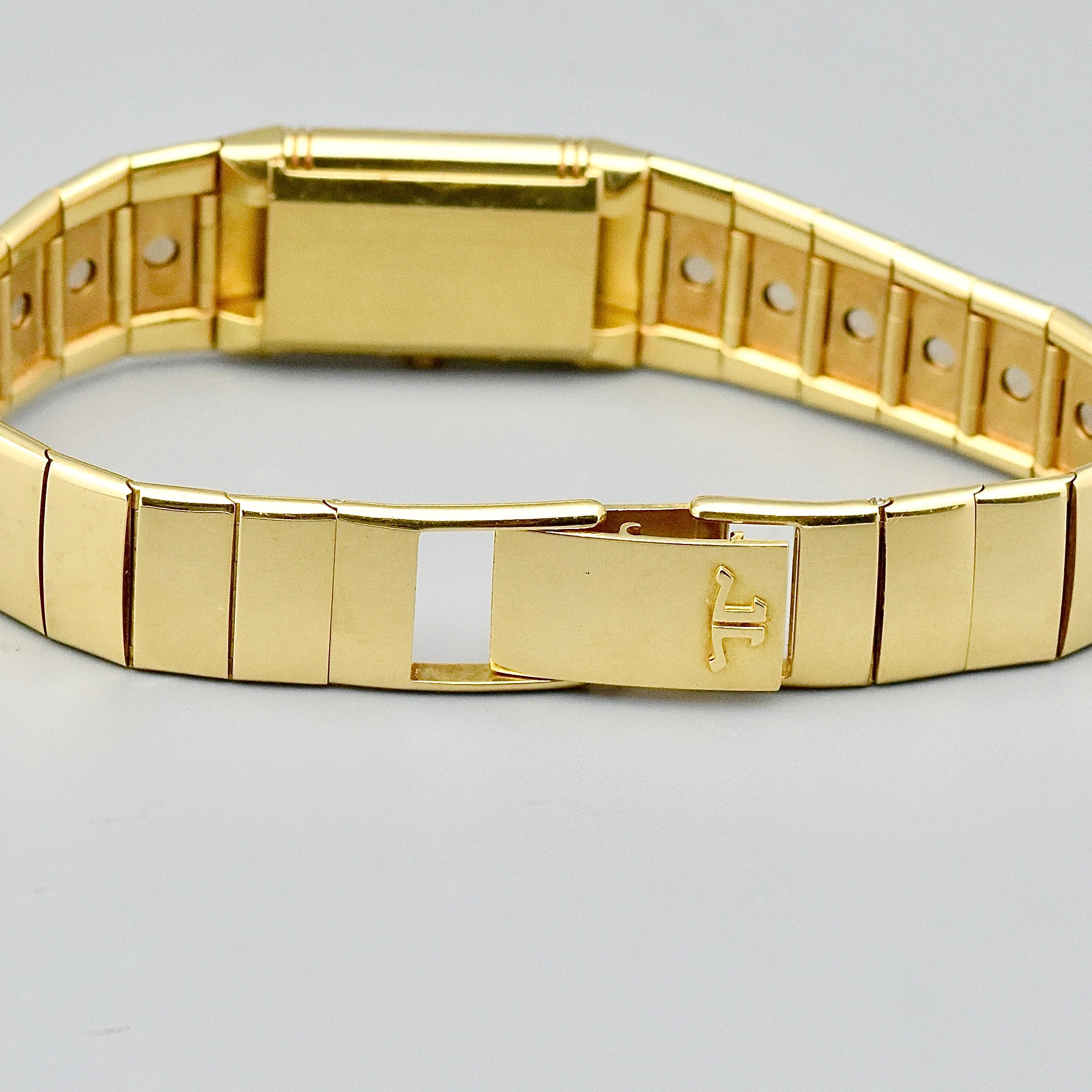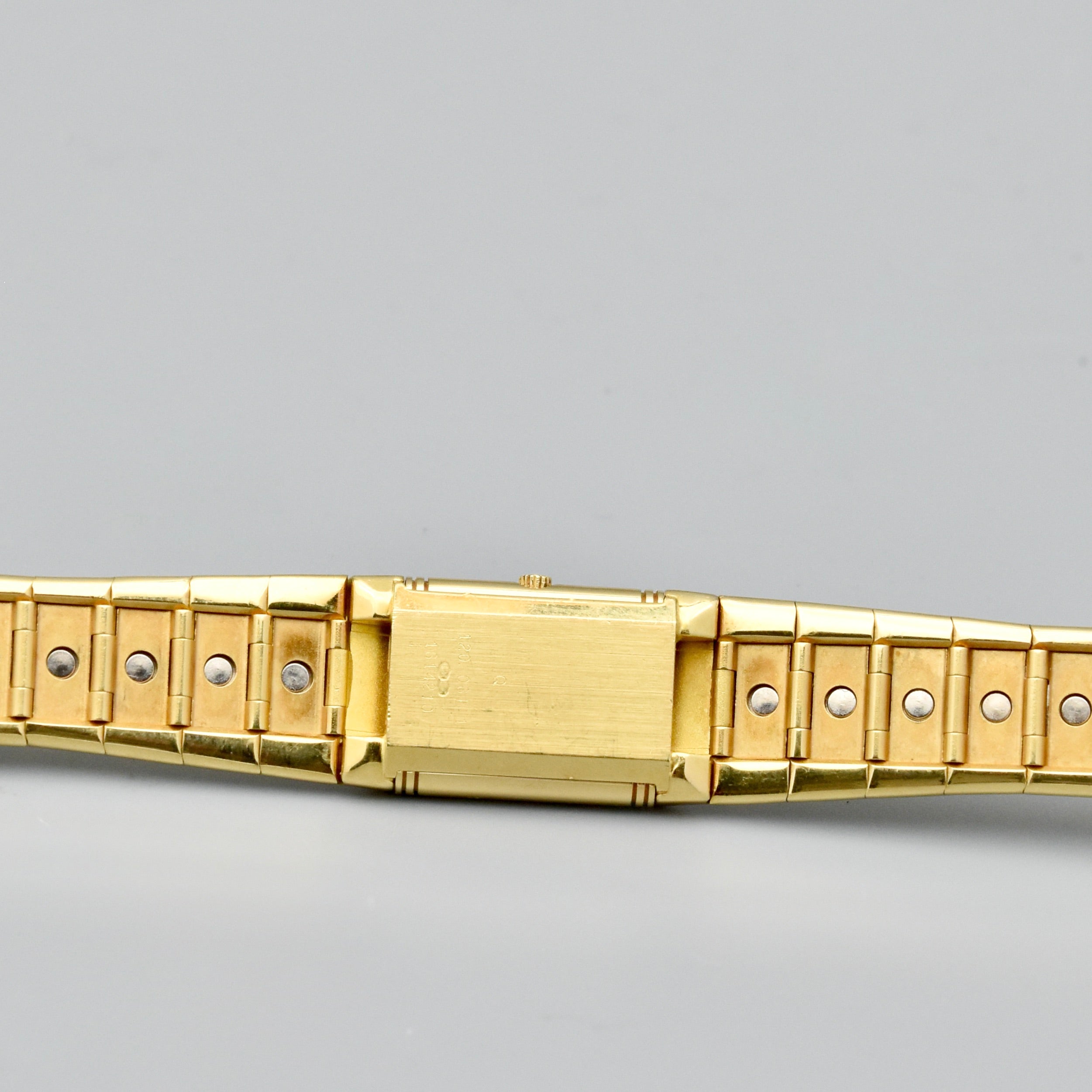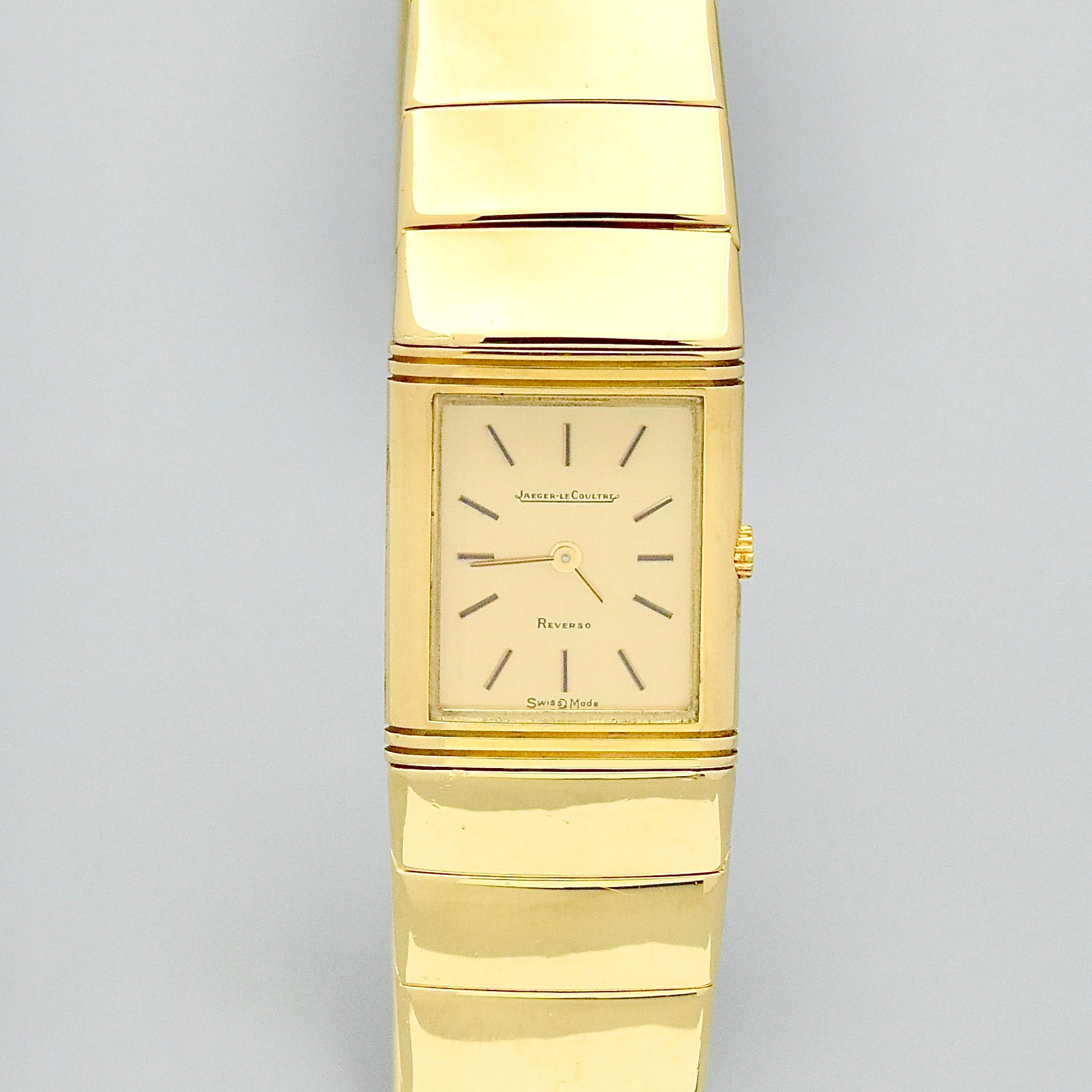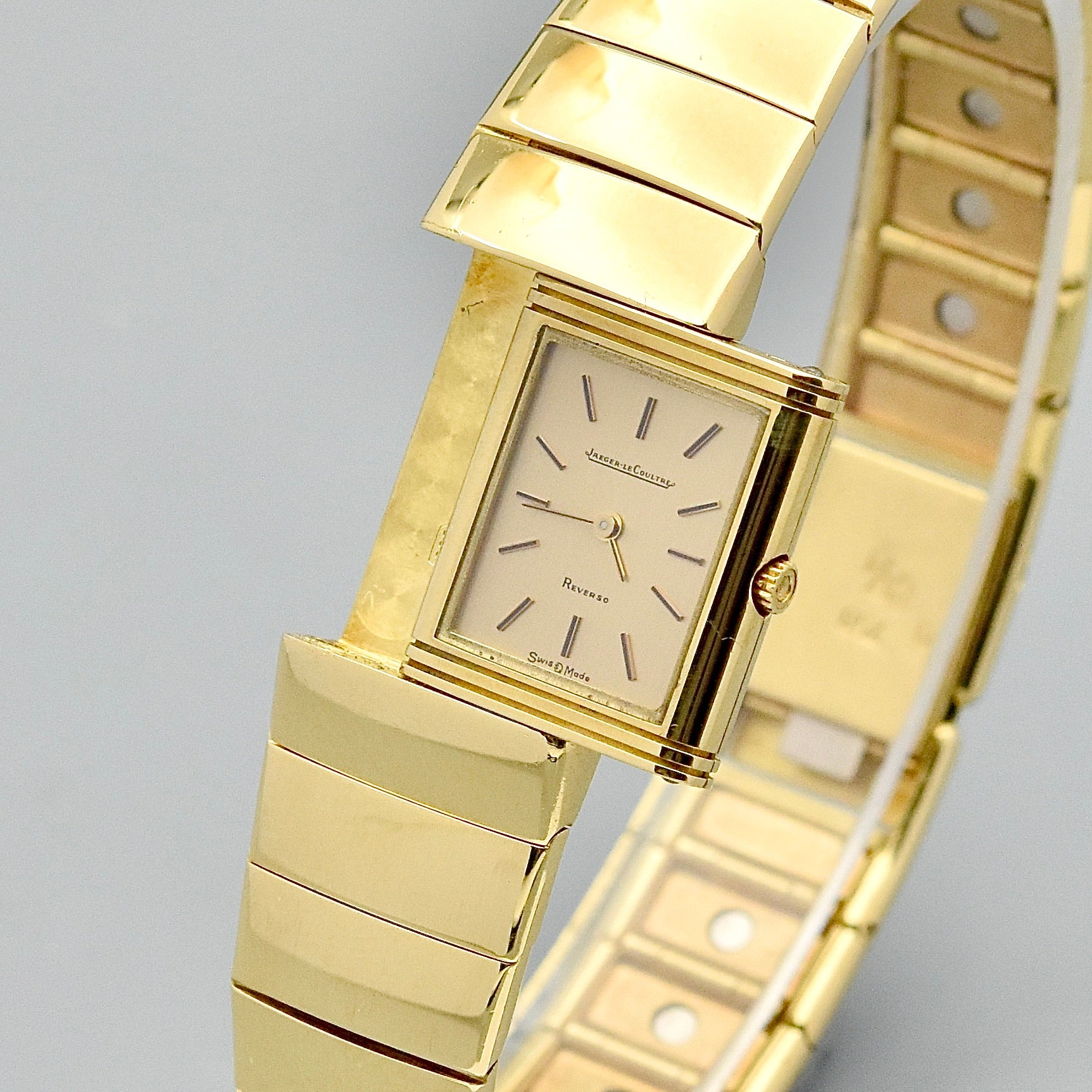 Superbe et très rare montre bracelet de dame Jaeger Lecoultre Reverso en or jaune sur bracelet articulé en or jaune avec fermoir en or jaune Jaeger Lecoultre. Boîtier rectangle réversible. Cadran or avec index bâton appliqués. Aiguilles bâtons or. Mouvement quartz
