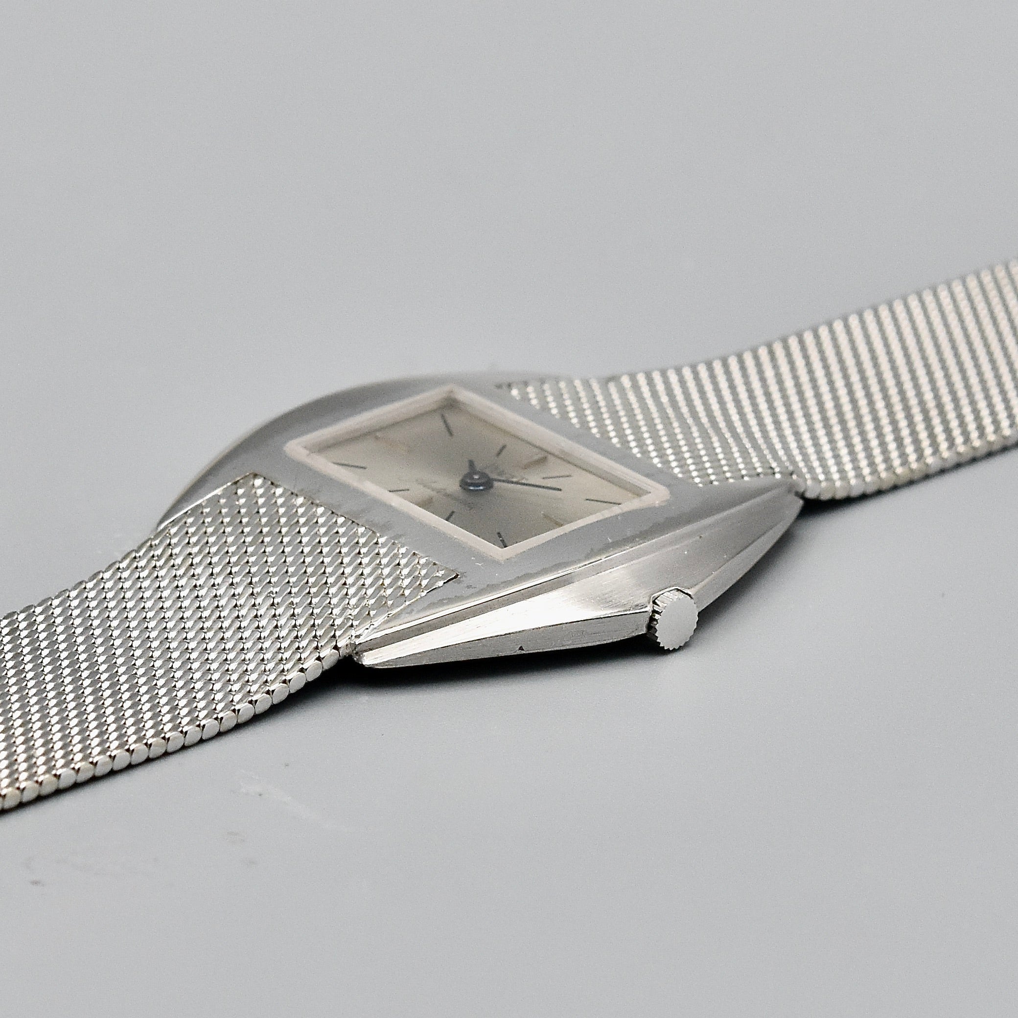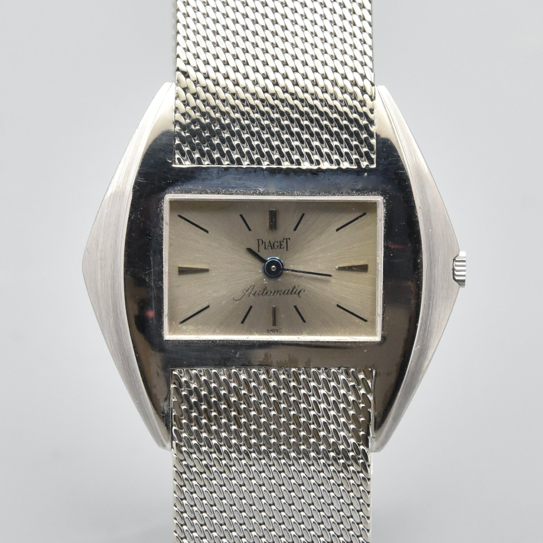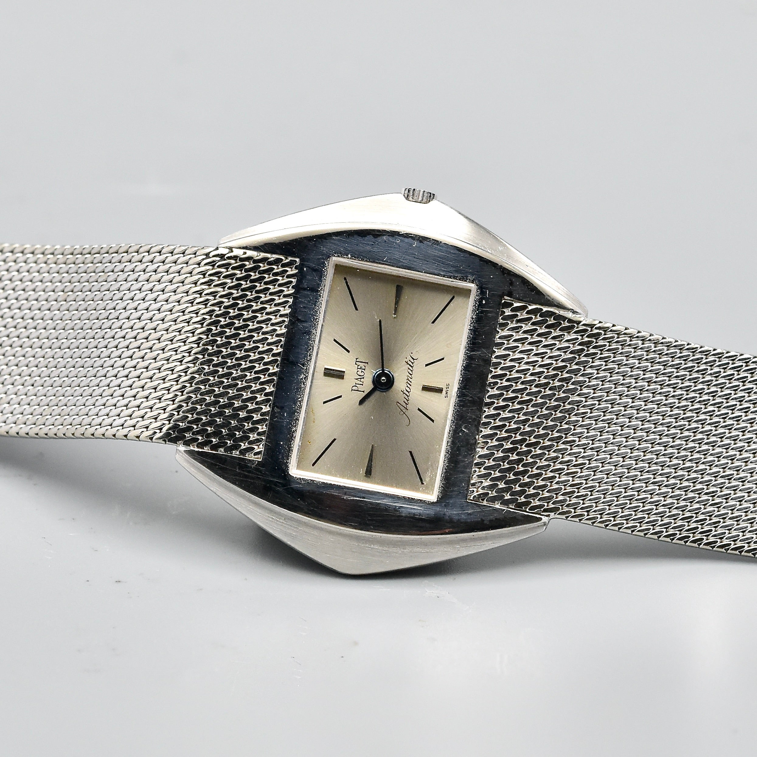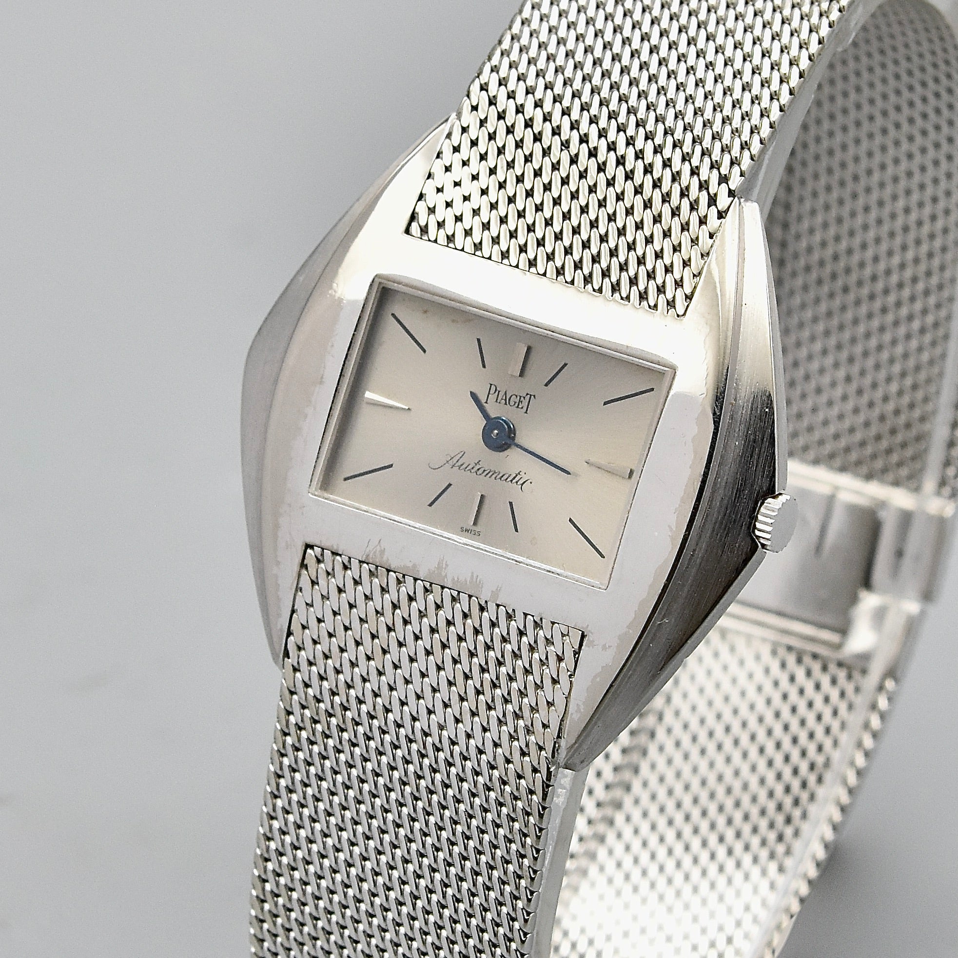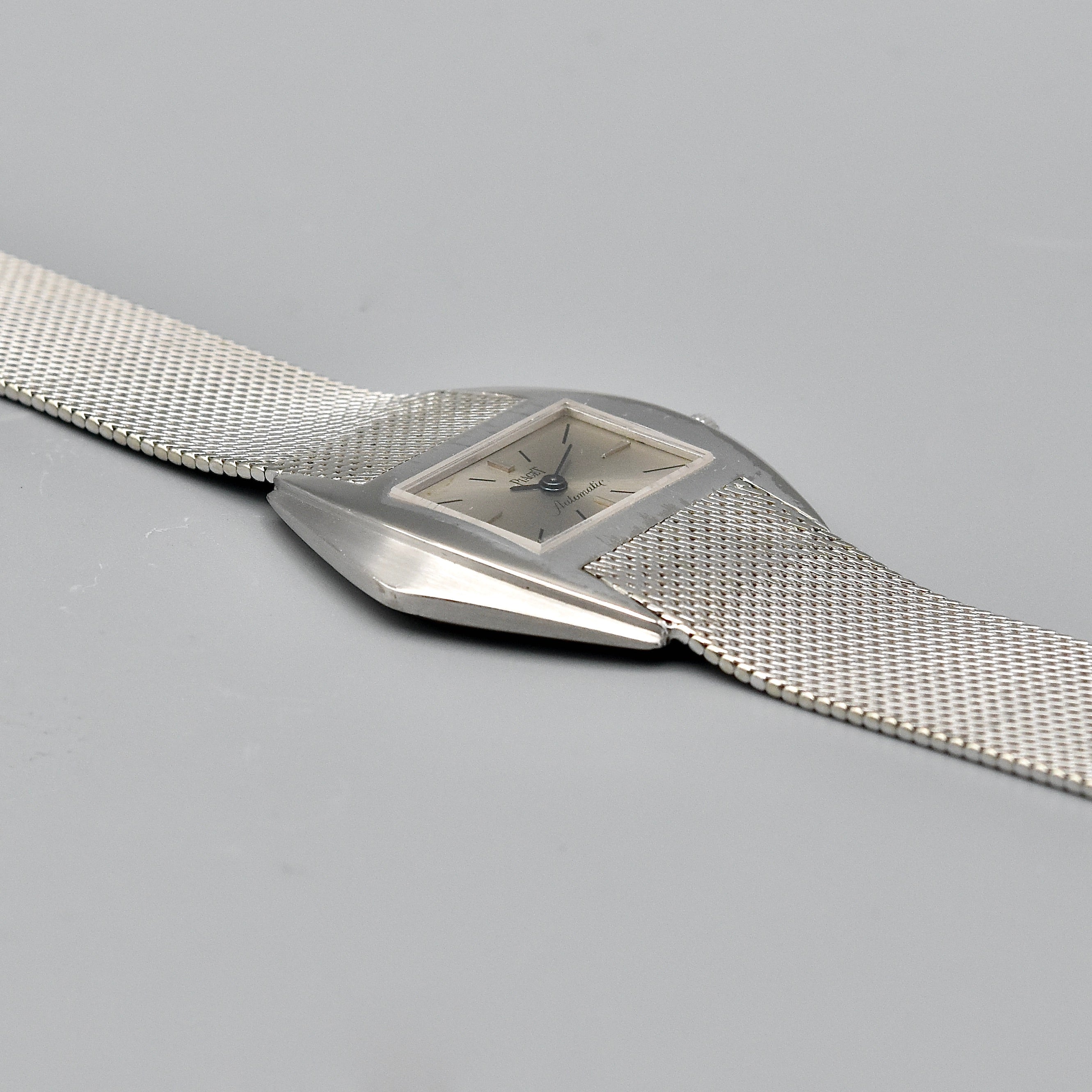 Superbe et très rare montre bracelet en or blanc sur bracelet intégré en or blanc signé Piaget. Boîtier stylisé. Cadran argent avec index bâton appliqués et peints. Mouvement automatique calibre 12P1. Diamètre: 34 mm.