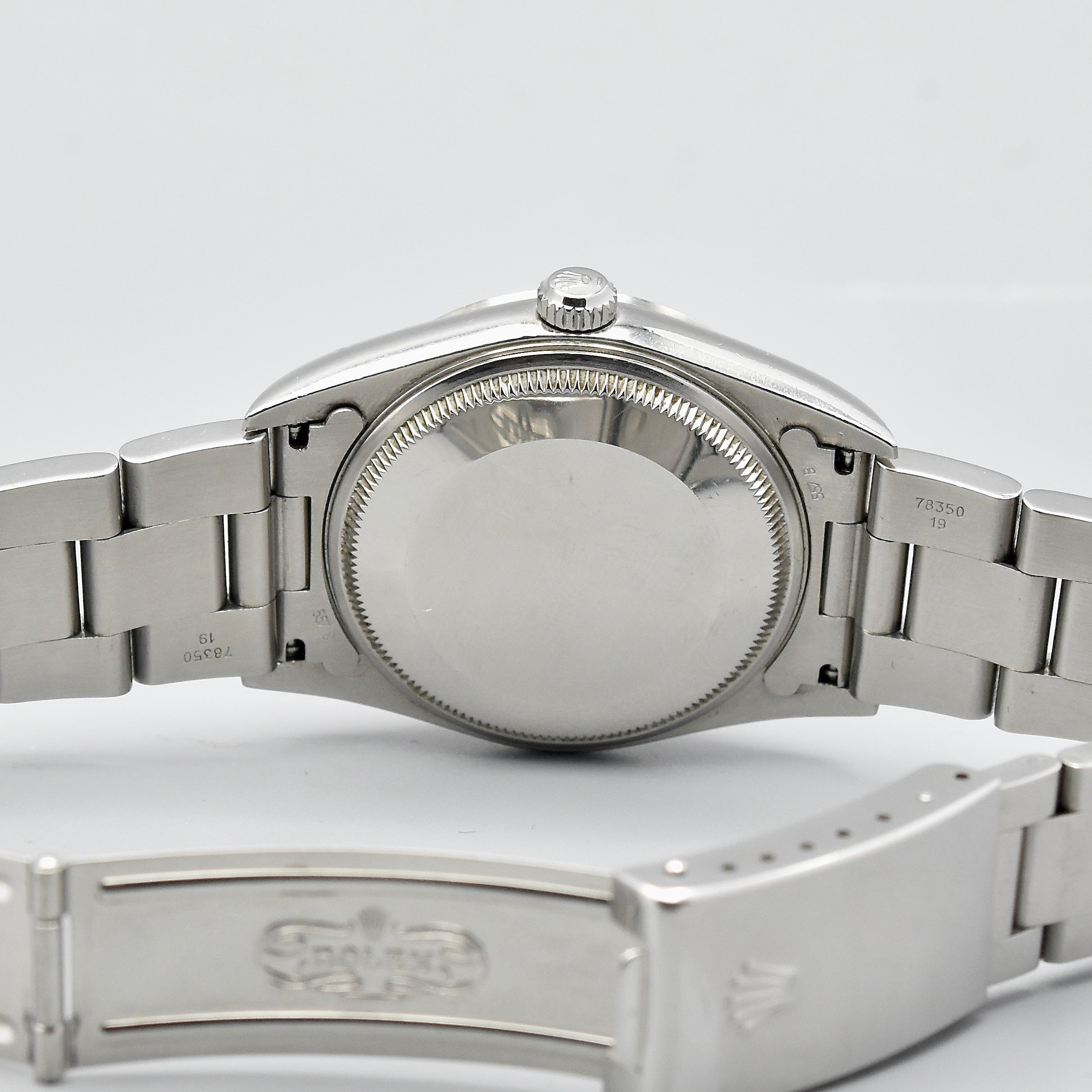 Belle montre bracelet Rolex en acier sur bracelet Oyster en acier avec boucle déployante en acier signée. Boîtier rond. Couronne et fond vissés. Cadran bleu avec index et chiffres arabes 3, 6, 9 appliqués. Aiguilles bâton. Trotteuse centrale. Mouvement automatique. Diamètre: 34 mm.